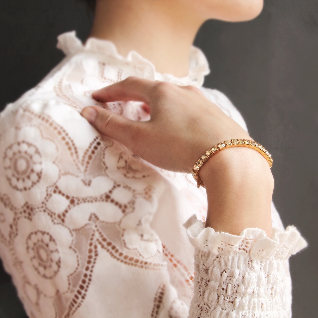 De kristallen zijn geregen op een elastische band, wat het heel eenvoudig maakt om de armband te dragen. Ideaal voor elke gelegenheid, hij ontsteekt duizend vlammen met Golden Shadow Swarovski kristallen. Handgemaakt met liefde in Europa |